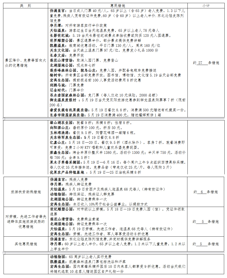 近日,记者从长春市旅游局了解到,截至目前,今年通过免票、降价、活动等方式向公众推出惠民措施43项,开展或在筹备的各类相关配套活动21个。