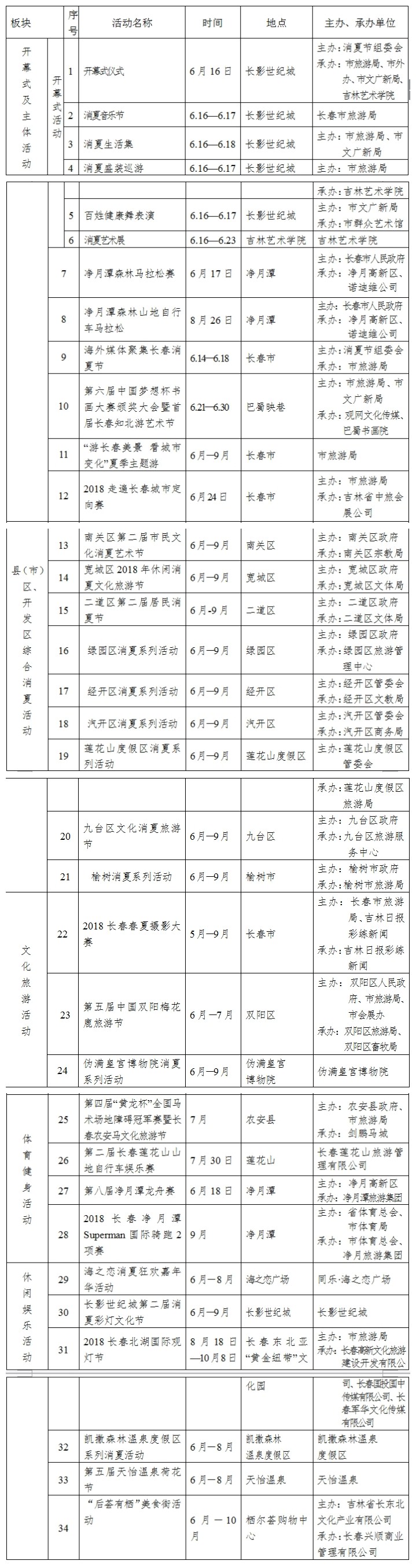 县(市)区、开发区综合消夏活动包括南关区、宽城区、二道区、绿园区、经开区、汽开区、莲花山区、九台区和榆树市具有本地区特点的消夏系列活动。如第四届“黄龙杯”全国马术场地障碍冠军赛暨长春农安马文化旅游节、第二届长春莲花山山地自行车娱乐赛、第八届净月潭龙舟赛和首次举办的2018长春净月潭Superman国际骑跑2项赛等。