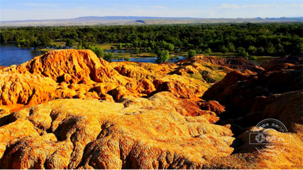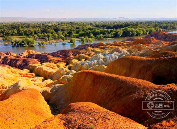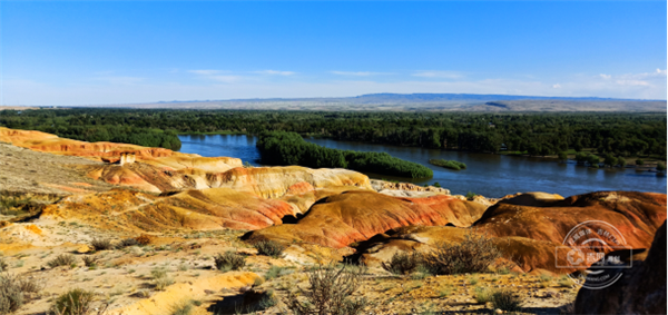 激猛的河流冲击以及狂风侵蚀,形成了北岸的悬崖式雅丹地貌。河岸岩层抗风化能力强弱不一,轮廓便会参差不齐。而岩石含有矿物质的不同,又幻化出种种异彩,因此得名“五彩滩”。而南岸却是绿树葳蕤,连绵成林,远处逶迤的山峦与戈壁风光尽收眼底。