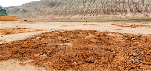 火焰山山体沟壑林立,曲折雄浑,寸草不生。在炎热的夏季,裸露的表层在太阳烘烤下温度可达75℃,热浪翻滚,使人透不过气来。由于地层堆积比较水平,加上岩层软硬相间,在经年雨水侵蚀下,顺坡形成一条条沟壑。山体侵蚀下来的物质,在山麓前形成红色的洪积扇裙,扇裙前缘在干旱环境下又形成无数多边形龟裂,格外引人瞩目。