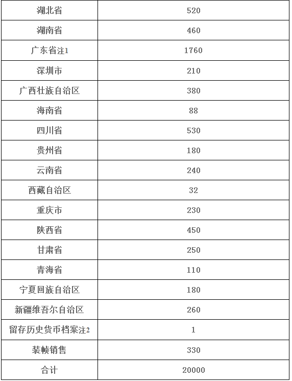 注:(1.表中广东省数量不包含深圳市数量。2.中国人民银行在每次发行新币时,均在发行库中留存一定数量,作为实物档案,供未来货币研究使用,这部分货币归为留存历史货币档案。3.中国人民银行可能根据各地预约情况对各省、自治区、直辖市的分配数量进行调整,调整结果将另行公布。)