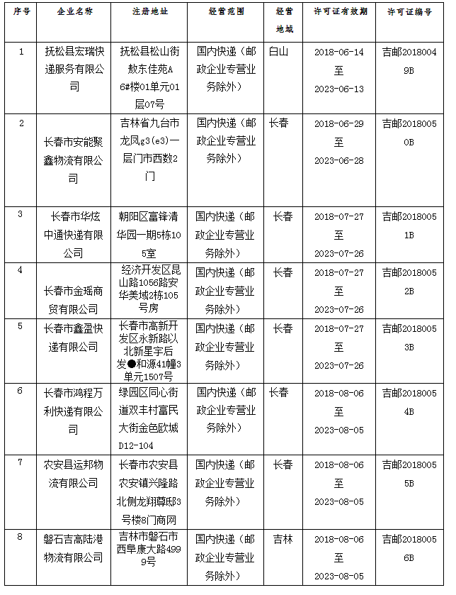 7日,中国吉林网、吉刻APP记者从吉林省邮政管理局获悉,日前该局发布“关于颁发快递业务经营许可证的公告”,根据《中华人民共和国邮政法》,并依照《快递业务经营许可管理办法》规定程序进行审查,以下企业符合许可条件,予以颁发快递业务经营许可证,现予公布。