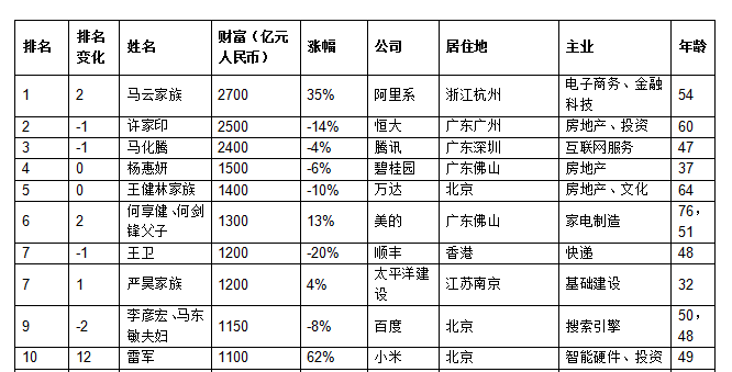 榜单内容显示,54岁的马云及其家族财富增长700亿,以2700亿时隔四年再次成为中国首富;去年首富,60岁的许家印财富缩水400亿,以2500亿位列第二;47岁的马化腾财富缩水100亿,以2400亿位列第三。