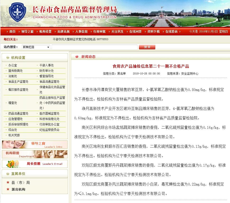 长春市净月潭商贸大厦销售的笨豆芽,4-氯苯氧乙酸钠检出值为0.80mg/kg,标准规定为不得检出。检验机构为吉林省产品质量监督检验院。