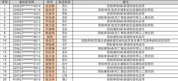 11月15日,吉林省交警总队曝光了20名终身禁驾人员名单,以使广大机动车驾驶人受到警示教育,清醒认识交通事故肇事逃逸的严重后果,提高遵守交通法律法规的自觉性。