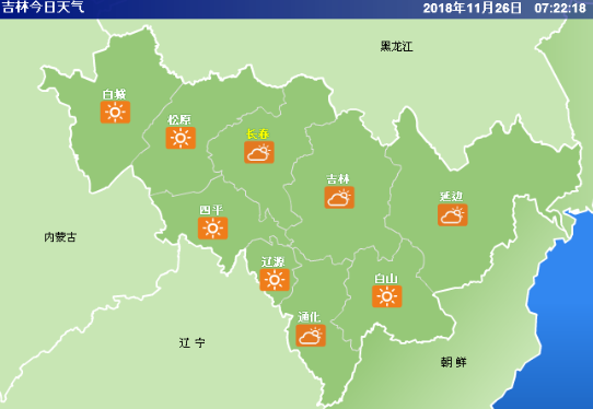 11月26日,吉林省最高温度为9摄氏度,但是风很大,吉林省气象台在6时发布大风蓝色预警:吉林省气象台11月26日6时40分发布大风蓝色预警信号:预计未来24小时,白城、松原、长春、四平、辽源、吉林有5~6级西南风,瞬间风力可达7~8级。请注意做好防风、防火工作。26日白天到夜间,通化、白山、延边西部、长白山保护区多云,有小雪,其他地区晴有时多云。