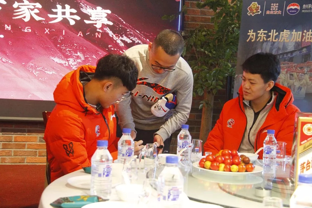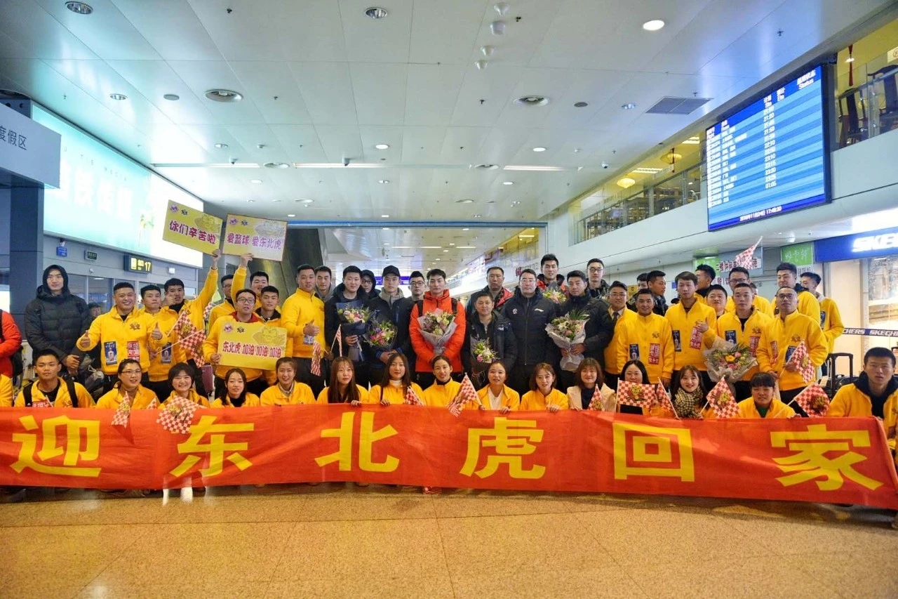 官方球迷会成员手持“你们辛苦了”“爱篮球看东北虎”“东北虎加油”等标语,身着统一的黄色服装迎接东北虎将士。