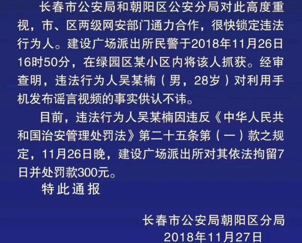 11月27日,长春市公安局朝阳区分局公布了对“亚细亚牌子砸死人,3死2伤”这一谣言造谣者的处罚通报。警方提醒:根据《治安管理处罚法》第二十五条规定:散布谣言,谎报险情、疫情、警情或者以其他方法故意扰乱公共秩序的,处五日以上十日以下拘留,可以并处五百元以下罚款;情节较轻的,处五日以下拘留或者五百元以下罚款。