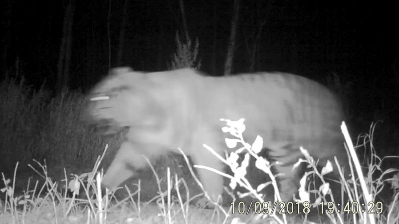 天桥岭林业局新开林场动保员王俊波、森保员邓玉忠在入山巡护的过程中,采集两架远红外相机的信息时,发现了两段野生东北虎的视频影像,拍摄时间分别为2018年10月9日17时22分和2018年10月9日19时40分。视频里,山林幽暗,草木摇曳,一只东北虎双目如炬、威风凛凛,龙骧虎步地从镜头前走过。