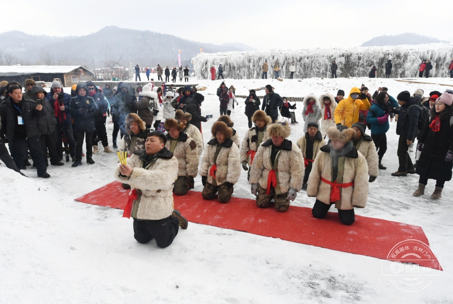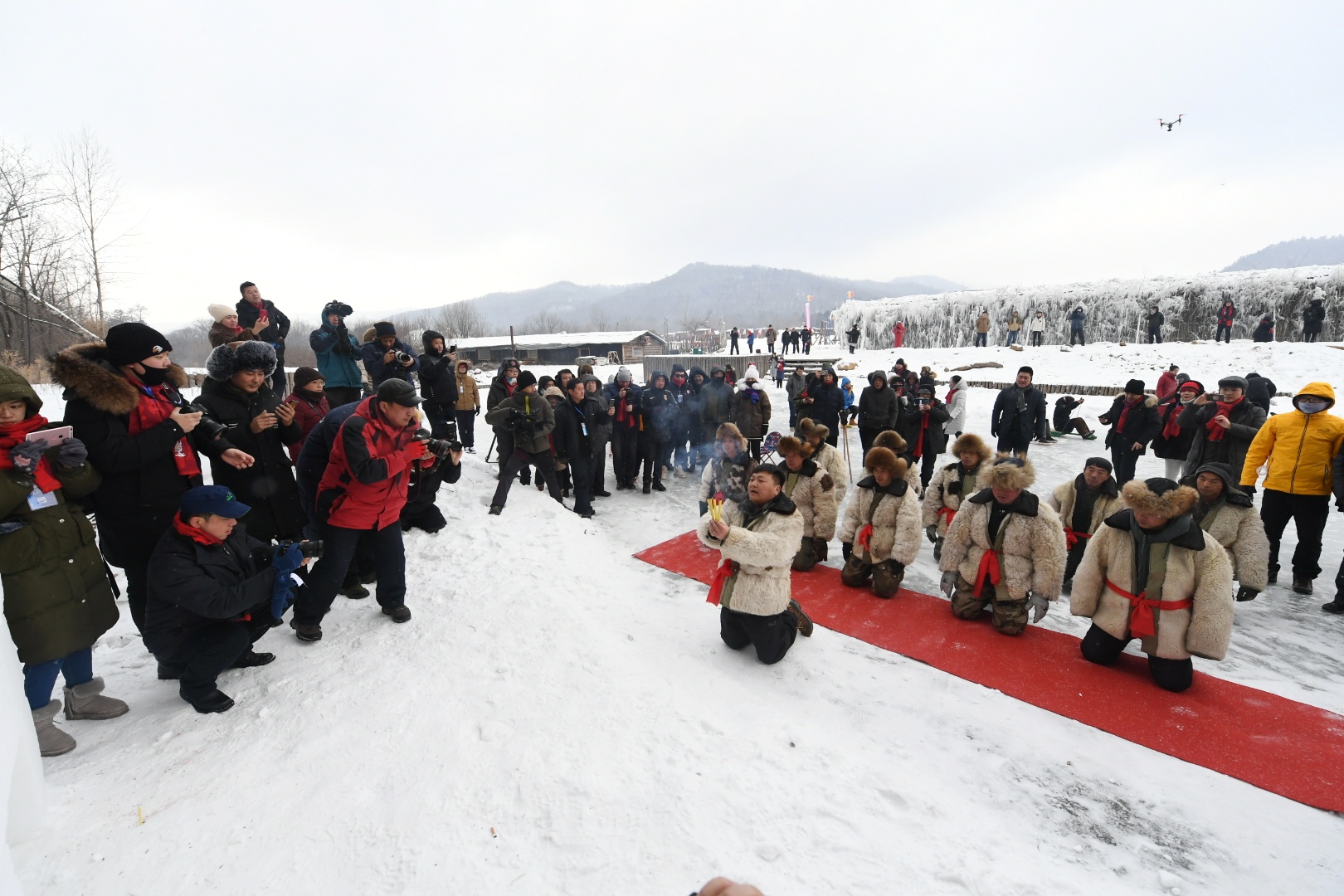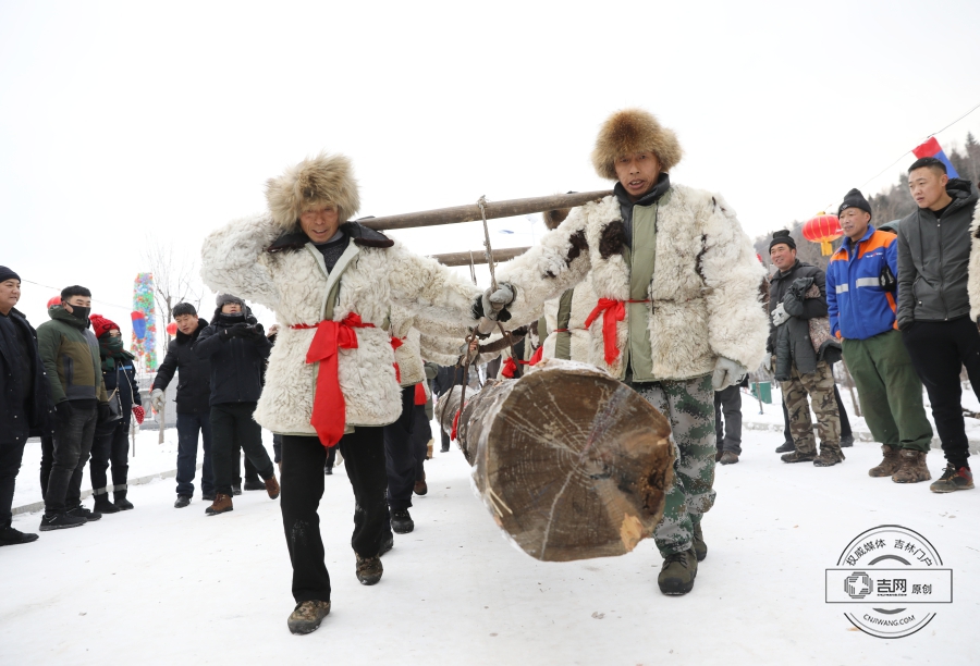 而当地村民唱着嘹亮的木工号子,模仿冰天雪地里的伐木工人爬冰卧雪,并演示用原始的方法抬着木头前进。