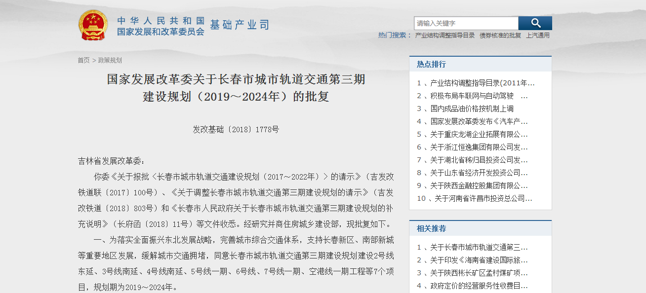 28日,国家发改委网站发布公告,国家发改委近日发布关于长春市城市轨道交通第三期建设规划(2019~2024年)的批复,同意长春市城市轨道交通第三期建设规划建设2号线东延、3号线南延、4号线南延、5号线一期、6号线、7号线一期、空港线一期工程等7个项目,规划期为2019~2024年。新建项目总投资711.37亿元,其中资本金比例40%,计284.5亿元,由长春市财政资金解决;资本金以外的资金采用银行贷款等多元化融资模式解决。