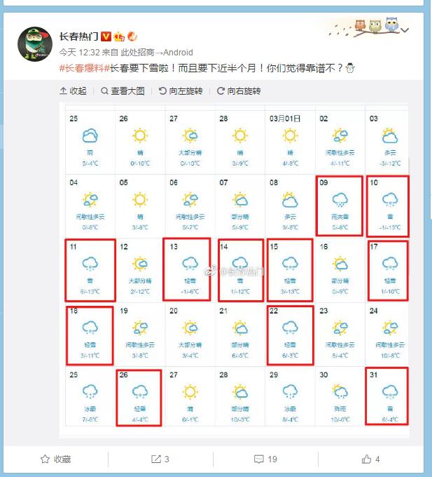 这个冬天对于东北来说,是一个没有灵魂的冬季,主题色不再是白色,室外看不到白雪皑皑的景象,整个冬季只下了两场大雪。今日有网友在网上爆料一张长春45天气象预报,其中3月份有11天下雪,靠谱吗?