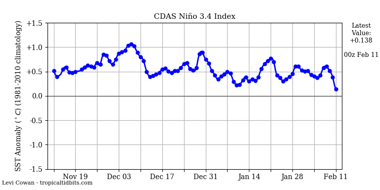 气象专家杨学祥表示,2019年2月10日12时,厄尔尼诺指数为0.243,比2019年2月10日06时厄尔尼诺指数为0.318减速0.075,减速变快,进入下降区间,厄尔尼诺夭折不代表它对于地球大气层没有影响,信风减弱、表层海水温度异常增暖等因素仍然留在了太平洋上,持续干扰太平洋的环流模式,因此它仍然可能正在影响我们的天气,但它带来的影响与一般的厄尔尼诺或许不太一样。所以会出现美国极端低温和我国“北雪南下”等等特殊天气。
