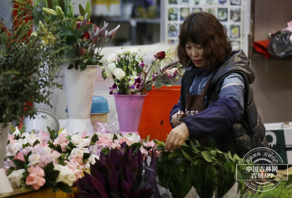 “老板,这个599元的玫瑰手捧花来一个,明天中午取,钱扫支付宝了……”长春圈楼一层鲜花批发区,一位90后小伙子爽快地为女友购买了一束红色玫瑰手捧花,一旁的老板黄丽英微笑着为其开具了凭证,说了一声再见后,又蹲到地上扎起了鲜花。
