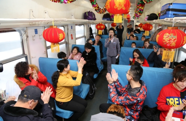 19日8时,4318次列车2号车厢,一场由旅客和列车员联袂演出的歌舞拉开了列车元宵联欢会的序幕。