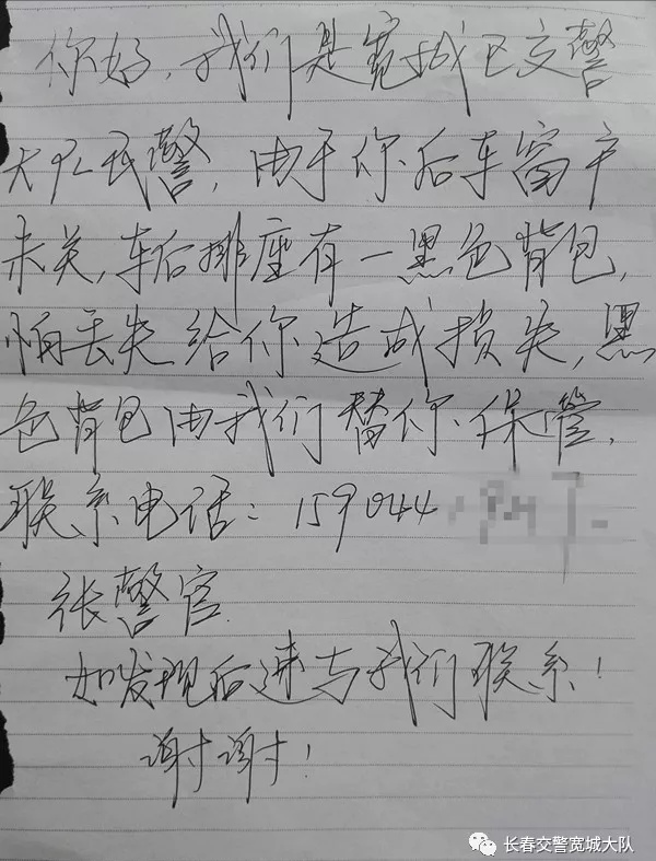 大约1小时后民警武强接到车主电话,表明身份后将事情向他解释清楚,车主称正在办理重要事情,不能马上过来取东西。最后民警告诉他先行将包带回大队代为保管,等车主办完事情后到大队领取。不久后该驾驶员赶来取回背包,并对民警表示感谢。
