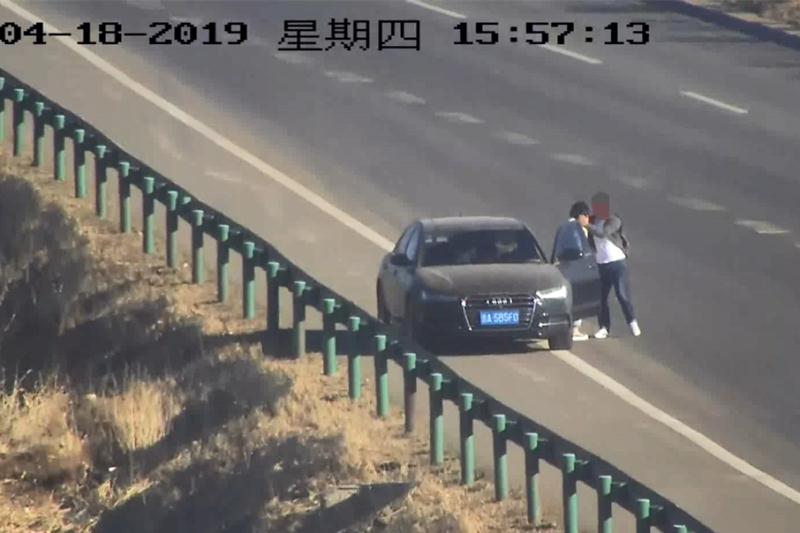 4月18日15时47分许,白城分局指挥中心民警通过视频监控系统发现一辆黑色小轿车停在了珲乌高速大安收费站出口匝道处,副驾驶一男子下车一路小跑到驾驶位与驾驶车辆的女子交换位置,在上车前还用手摸了一下女子的脸庞。这“恩爱”的一幕被视频监控完整的记录了下来。