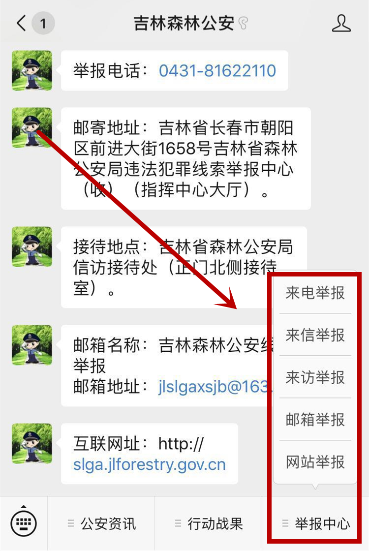 为全面提升打击各类犯罪效能,优化完善线索举报机制,吉林省森林公安局违法犯罪线索举报中心正式成立,举报方式如下: