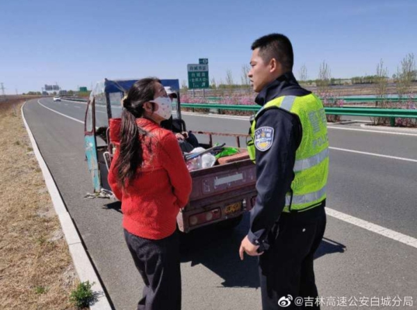 5月1日上午11时许,吉林高速公安白城分局巡逻大队民警在白城绕城高速1公里处发现一辆三轮车在高速上逆行,十分危险。