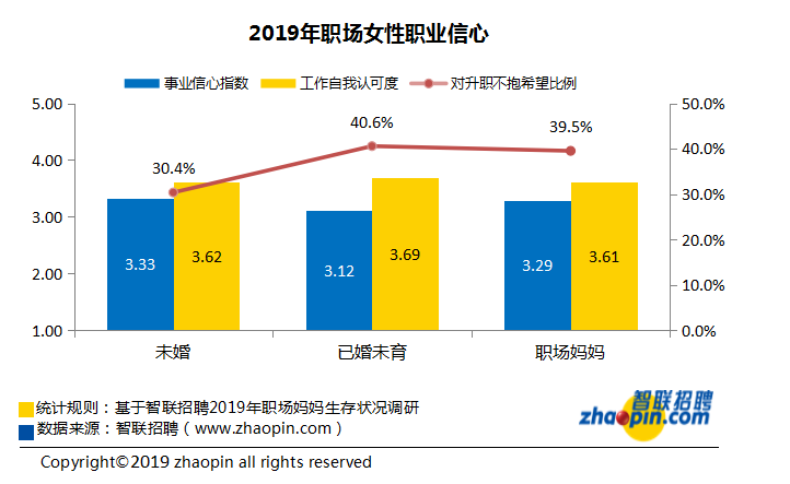 从不同职位的职场妈妈对事业的信心和对自我的评价来看,职位越高,信心越足,对自己的表现也给予更多积极的自我认可,而职位较低的职场妈妈们要在突破晋升“天花板”方面承受承受更多压力和挑战,导致自信心受挫。