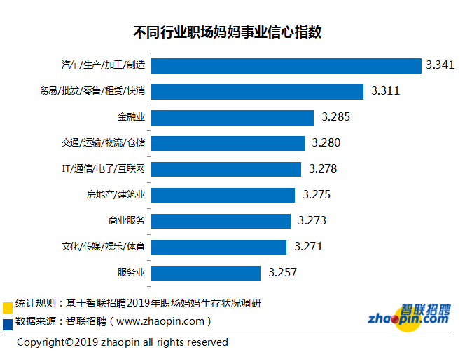 不同行业对职场妈妈体现出对事业信心的差别不大,从数值上看,汽车制造业及贸易批发行业的职场妈妈们对事业信心指数较高,服务业对职场妈妈事业信心最低,服务业普遍自由时间少且劳动强度大,工作的心酸加上养娃的压力势必影响妈妈们的事业信心。