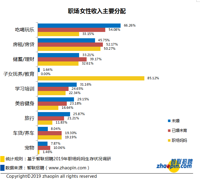 子女教育抚养/教育是职场妈妈最普遍的收入分配途径,而未婚女性和已婚未育人群则主要用于吃喝玩乐享受生活。