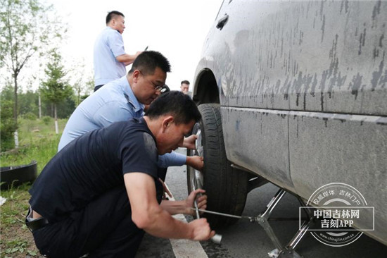 见此情况后,民警立即下车,将焦急等待的女士和孩子请到班车上避雨。及时将警示标志立于较远处公路上,安装千斤顶,协力将被扎轮胎换下,并将备用轮胎安装上,前后不到5分钟,车辆恢复正常。“我们本来是等待家人过来帮忙,没想到遇到你们,帮了我这个大忙,真是太幸运了,谢谢警察同志们。”车主激动地说。