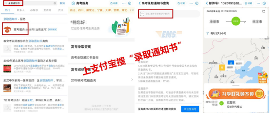 据悉,这是继上月推出十多个省市的高考查分服务后,中国政务服务平台支付宝小程序又推出了一项针对考生的新服务。上支付宝搜索“录取通知书”,即可进入中国政务服务平台查询通知书EMS寄送信息。