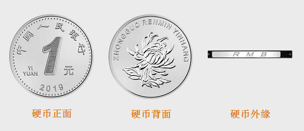 2019年版第五套人民币1元硬币保持1999年版第五套人民币1元硬币外形、外缘特征、“中国人民银行”行名、汉语拼音面额、人民币单位、花卉图案、汉语拼音行名等要素不变,调整了正面面额数字的造型,背面花卉图案适当收缩。直径由25毫米调整为22.25毫米。正面面额数字“1”轮廓线内增加隐形图文“¥”和“1”,边部增加圆点。材质保持不变。