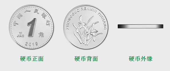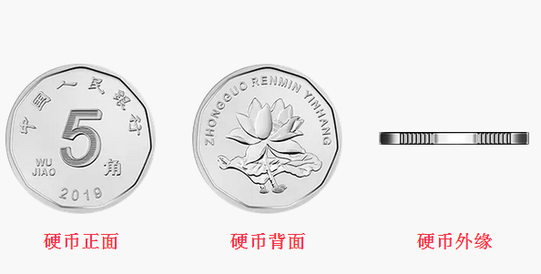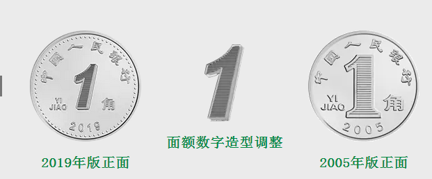 2019年版第五套人民币1角硬币保持2005年版第五套人民币1角硬币外形、外缘特征、“中国人民银行”行名、汉语拼音面额、人民币单位、花卉图案、汉语拼音行名等要素不变,调整了正面面额数字的造型,背面花卉图案适当收缩。正面边部增加圆点。直径和材质保持不变。