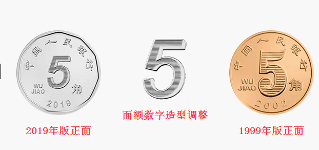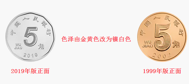 2019年版第五套人民币5角硬币保持1999年版第五套人民币5角硬币外形、外缘特征、“中国人民银行”行名、汉语拼音面额、人民币单位、花卉图案、汉语拼音行名等要素不变,调整了正面面额数字的造型,背面花卉图案适当收缩。材质由钢芯镀铜合金改为钢芯镀镍,色泽由金黄色改为镍白色。正背面内周缘由圆形调整为多边形。直径保持不变。