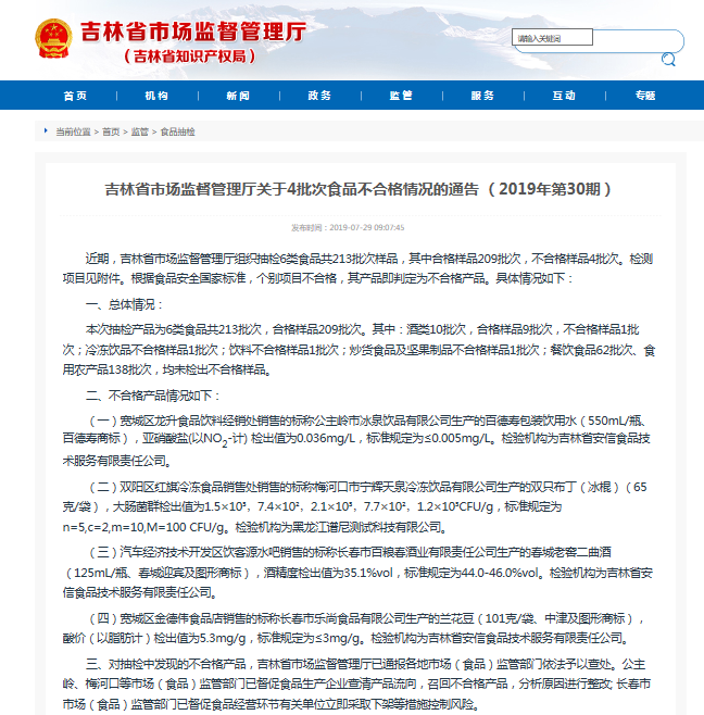 29日,吉林省市场监督管理厅发布4批次食品不合格情况的通告,内容显示近期吉林省市场监督管理厅组织抽检6类食品共213批次样品,其中合格样品209批次,不合格样品4批次。检测项目见附件。根据食品安全国家标准,个别项目不合格,其产品即判定为不合格产品。具体情况如下:
