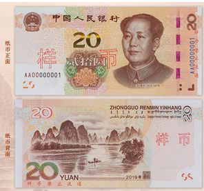 正面中部面额数字调整为光彩光变面额数字“20”;调整装饰团花的样式,取消全息磁性开窗安全线;左侧增加装饰纹样,调整横号码、胶印对印图案的样式;右侧增加光变镂空开窗安全线和竖号码,调整毛泽东头像、右上角面额数字的样式,取消凹印手感线。