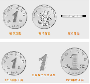 2019年版第五套人民币1元硬币保持1999年版第五套人民币1元硬币外形、外缘特征、“中国人民银行”行名、汉语拼音面额、人民币单位、花卉图案、汉语拼音行名等要素不变,调整了正面面额数字的造型,背面花卉图案适当收缩。直径由25毫米调整为22.25毫米。正面面额数字“1”轮廓线内增加隐形图文“¥”和“1”,边部增加圆点。材质保持不变。