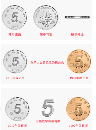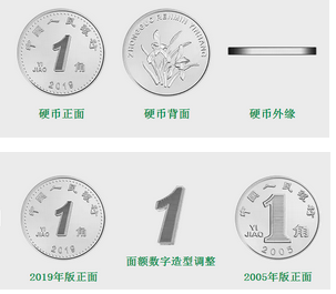 2019年版第五套人民币1角硬币保持2005年版第五套人民币1角硬币外形、外缘特征、“中国人民银行”行名、汉语拼音面额、人民币单位、花卉图案、汉语拼音行名等要素不变,调整了正面面额数字的造型,背面花卉图案适当收缩。正面边部增加圆点。直径和材质保持不变。