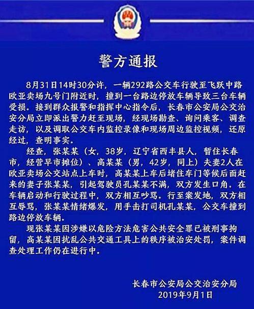9月1日,长春市公安局公交治安分局发布通报,张某某(女,38岁,辽宁省西丰县人,暂住长春市,经营早市摊位)、高某某(男,42岁,同上)夫妻2人在欧亚卖场公交站点上车时,高某某上车后堵住车门等候后面赶来的妻子张某某,引起驾驶员孔某某不满,双方发生口角。行至案发地,双方相互辱骂,张某某情绪爆发,用手击打司机孔某某,公交车撞到路边停放车辆。