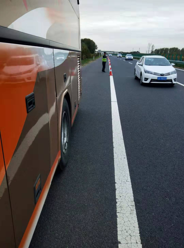 2019年10月3日14时30分许,长春分局巡逻六大队二中队中队长陈耀领和民警张立科巡逻至长深高速公路长春方向10公里处时,发现应急车道上停着一辆打着双闪的大型客车。