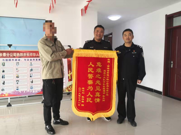 2019年10月10日上午,一名客车司机将一面写着“危难之处见真情 人民警察为人民”字样的锦旗送到吉林省公安厅高速公路公安局长春分局巡逻六大队民警的手中,以表达自己的感谢之情。他感动地说:“事发当天,自己和乘客被困在高速公路上,当时车流量很大,车速又快,自己非常无助,幸好民警同志及时出手相救,我们才成功脱困”。