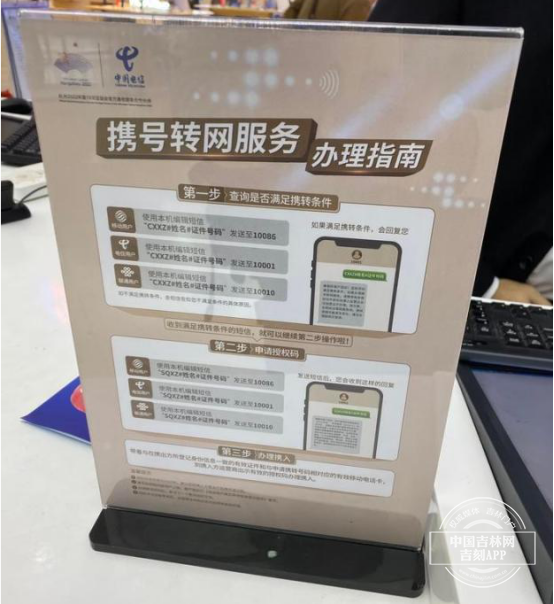 在中国移动营业厅的服务台,中国吉林网记者看到了携号转网服务办理指南:先发短信查询是否满足携转条件,再申请授权码,最后拿着身份证带着授权码就可以到营业厅办理携号转网业务了。