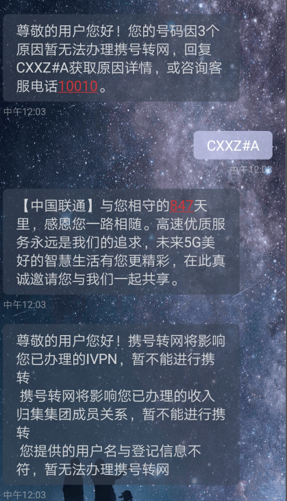 记者用单位统一发放的手机号照着说明操作了一番得到了短信反馈称:因3个原因暂无法办理携号转网,分别是IVPN、收入集团成员关系等。显然,记者未能“携转”成功的原因是办理了有一定时效的合约套餐或业务,而这也是阻碍大多数用户办理携号转网业务的主要原因之一。“现在的手机不仅是通话服务,更重要的是社交工具,很多人都绑定了亲情网、集团网等套餐,不是随便想换号就能换的。”工作人员告诉记者。