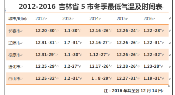 据数据来看,吉林省往年冬季最低温度基本在-30℃左右,时间集中每年12月22日冬至前后。冬至时太阳直射南半球回归线,北极地区为极夜,因此北半球接受阳光面积最小,全国气温在这时候达到最低点,所以最低气温出现的时间还算正常。然而今年的气温约比前几年高了10℃左右,这才让许多市民感觉今年入冬以来气温异常。