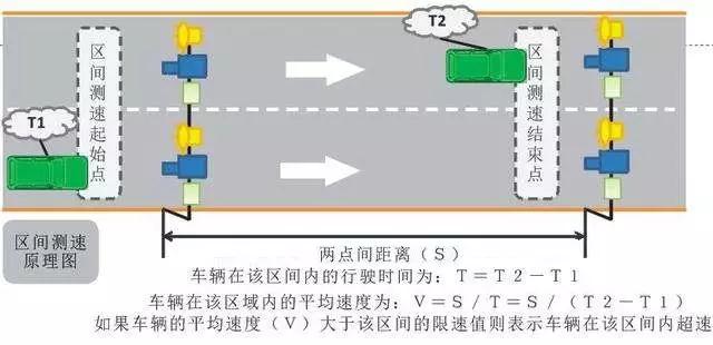 区间测速,是指在同一路段上布设两个相邻的监控点,基于车辆通过前后两个监控点的时间来计算平均速度判定速度,并依据该路段上的限速标准判定车辆是否超速违法。