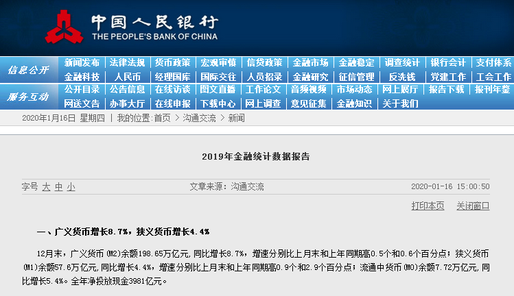 1月16日,央行发布的2019年金融统计数据报告内容显示,12月末,广义货币(M2)余额198.65万亿元,同比增长8.7%,增速分别比上月末和上年同期高0.5个和0.6个百分点;狭义货币(M1)余额57.6万亿元,同比增长4.4%,增速分别比上月末和上年同期高0.9个和2.9个百分点;流通中货币(M0)余额7.72万亿元,同比增长5.4%。全年净投放现金3981亿元。