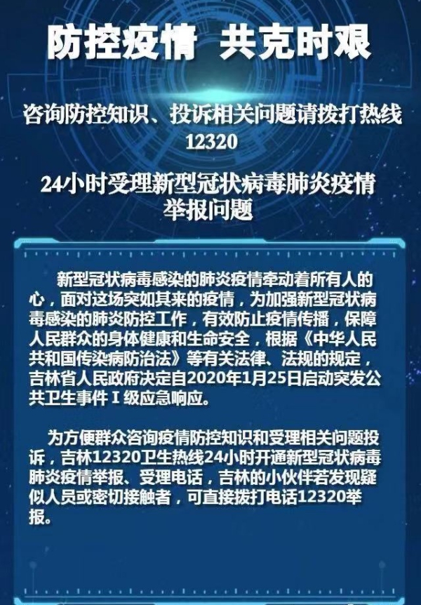 为此,中国吉林网联系了吉林省卫生健康委员会,为方便群众咨询疫情防控知识和受理相关问题投诉,吉林12320卫生热线24小时开通新型冠状病毒肺炎疫情举报、受理电话,吉林的小伙伴若发现疑似人员或密切接触者,可直接拨打电话12320举报。