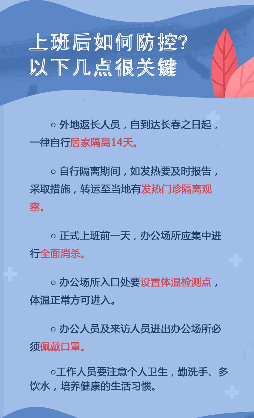 上班之后,如何防控很关键!外地返长的人员该怎么办?第一天上班之后办公室该如何消毒?怎么走进办公区?这些问题,下面这张图都有详细讲解!