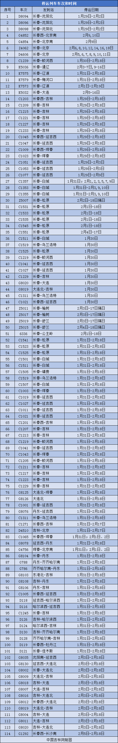 1月30日,中国吉林网从长春站获悉,自1月30日起,沈阳局集团公司根据旅客出行变化,进一步调整优化列车开行方案,对部分旅客列车采取临时停运措施。涉及长春站有114趟列车停运,其中始发经停龙嘉火车站的43趟列车自1月31日起至2月18日全部停运。已经购买停运列车车票的旅客可于票面乘车日期起30内(含当日)持车票到全国任一车站窗口办理退票手续,不收退票费。