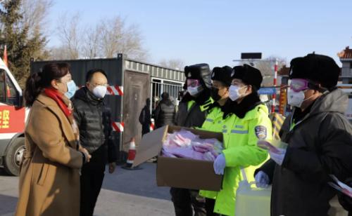 2月3日上午,长春交警副支队长苏照勋在净月卡口和高速公路东口,代表交警支队接受了吉大纱窗厂送来的酒精、喷壶等防护用品,警民情深给严寒的冬日带来了浓浓暖意。