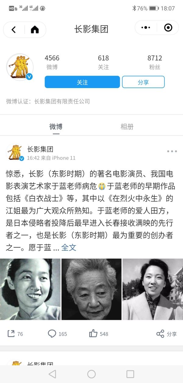 2月6日,有消息称著名电影表演艺术家于蓝去世。对此,长影集团给予澄清称,“于蓝只是病危,已经过了最为惊心动魄的抢救,并为之前的信息失误表示深深的歉意。”
