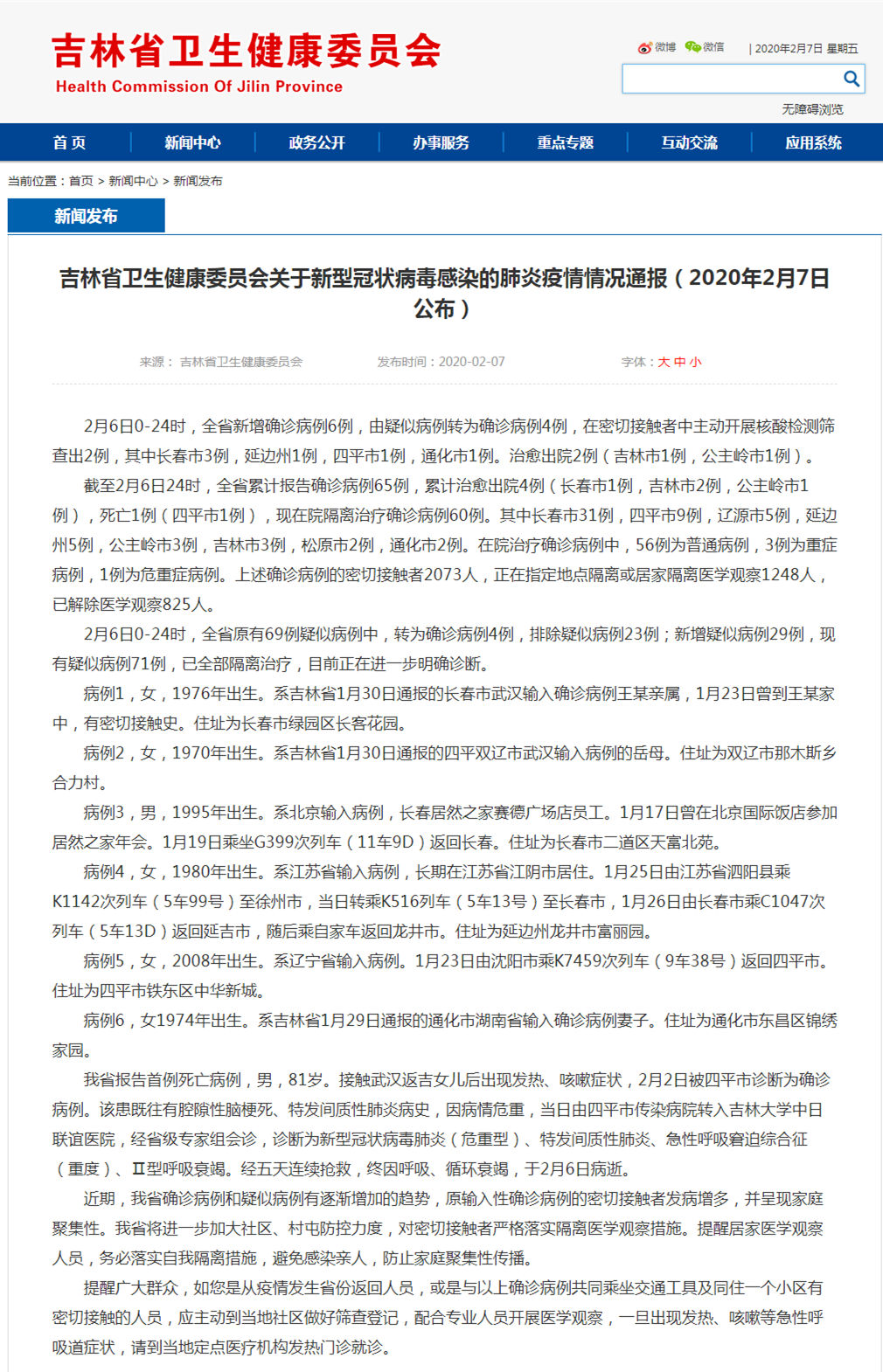 截至2月6日24时,全省累计报告确诊病例65例,累计治愈出院4例(长春市1例,吉林市2例,公主岭市1例),死亡1例(四平市1例),现在院隔离治疗确诊病例60例。其中长春市31例,四平市9例,辽源市5例,延边州5例,公主岭市3例,吉林市3例,松原市2例,通化市2例。在院治疗确诊病例中,56例为普通病例,3例为重症病例,1例为危重症病例。上述确诊病例的密切接触者2073人,正在指定地点隔离或居家隔离医学观察1248人,已解除医学观察825人。