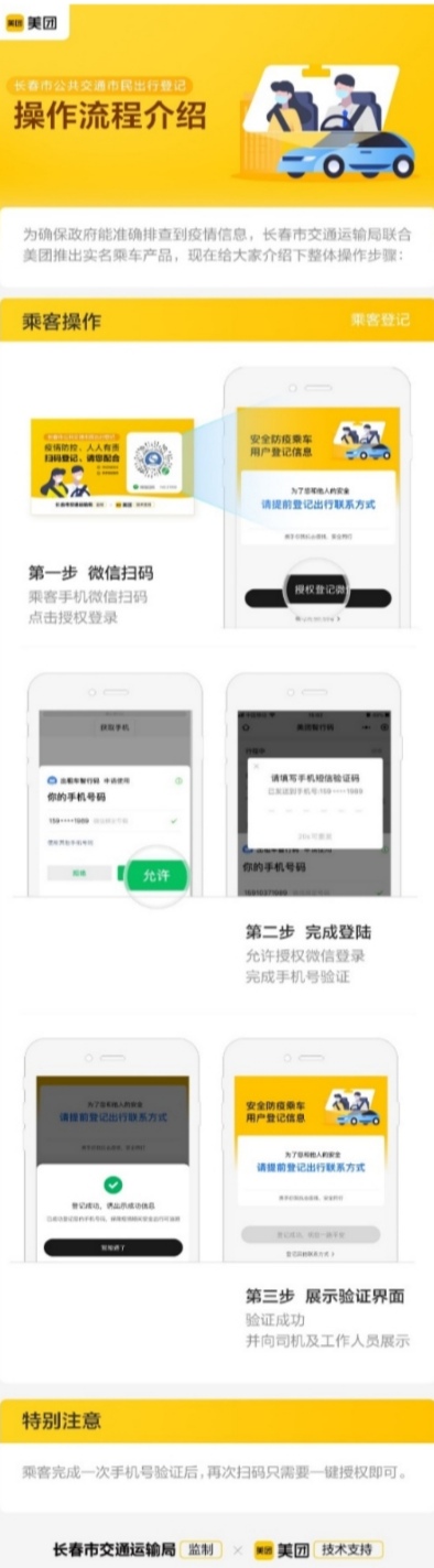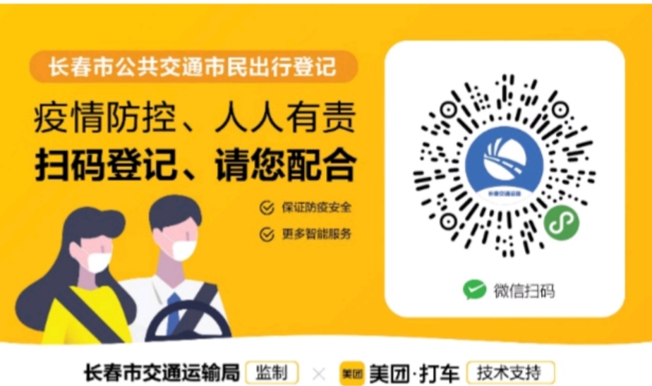 由长春市交通运输局组织,美团公司提供技术支持,专门开发了长春市公共交通市民出行实名制登记系统,通过在地铁站、公交车、出租汽车以及公路客运车辆上张贴专用二维码,市民乘车时使用微信扫描二维码,即可自动导入有效联系方式,作为疫情防控时追溯的依据。